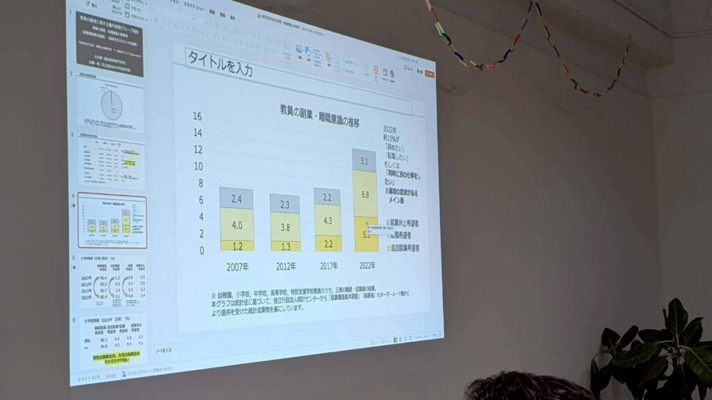 本イベントは、学校の外へ一歩踏み出したいと考える教員のための「作戦会議」として企画され、当日は20名以上の参加者が集まりました。