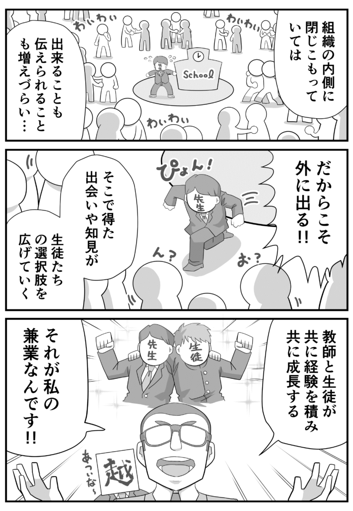 彼は、自身の苦い経験を子どもたちに繰り返させないため、そして教育現場をアップデートするために、自ら学校という枠を超え、越境学習に挑んでいます。